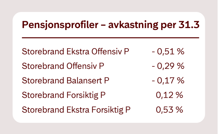 Tabellen under viser avkastningen i våre fem pensjonsprofiler i årets første kvartal. Dette er profilene de fleste av våre pensjonskunder har valgt. Dersom du har pensjonsprofilene gjennom arbeidsgiver, vil avkastningen være noe høyere. Du kan se dine egne tall i Kron-appen fra Storebrand eller i Min pensjon.